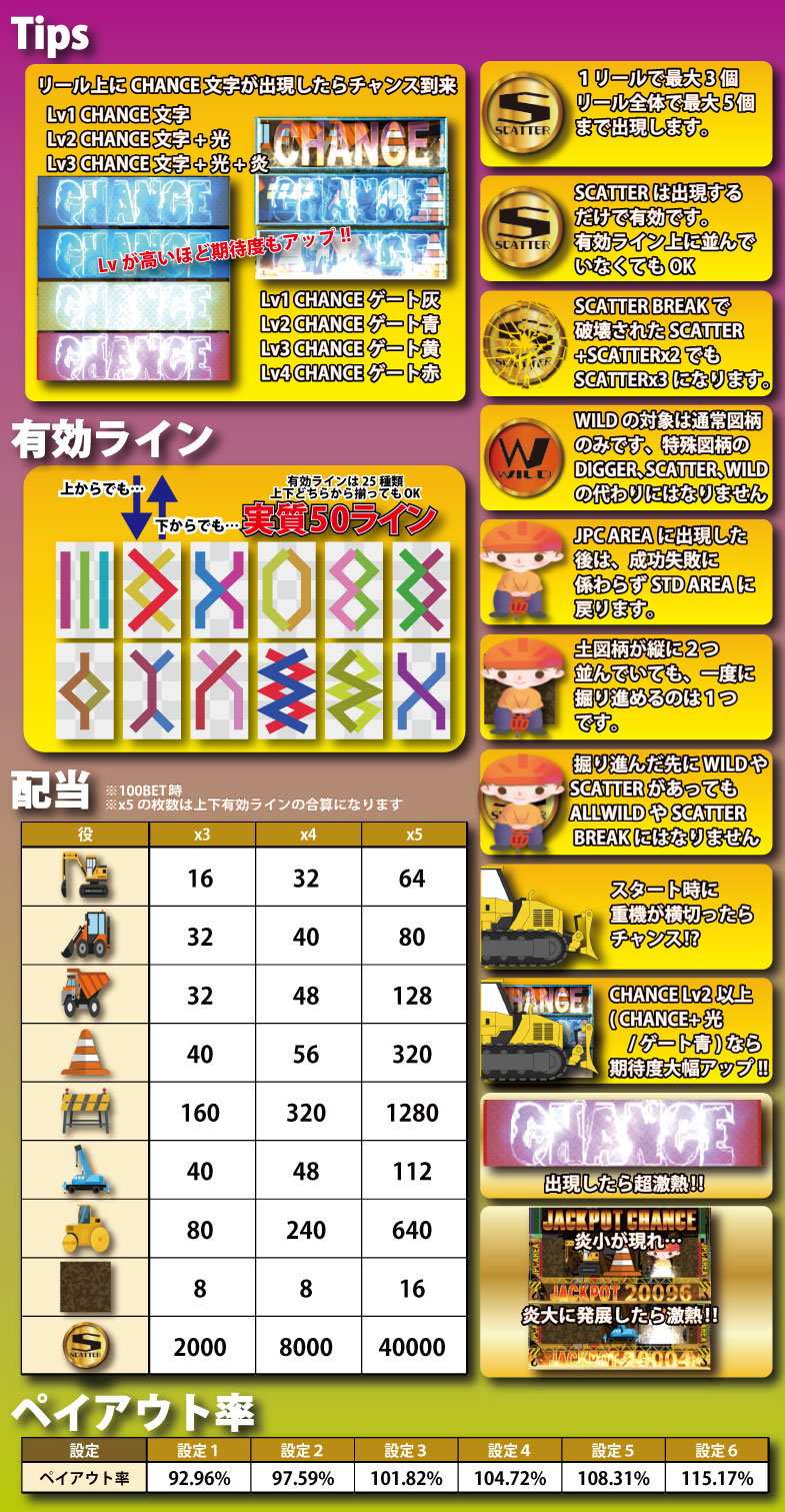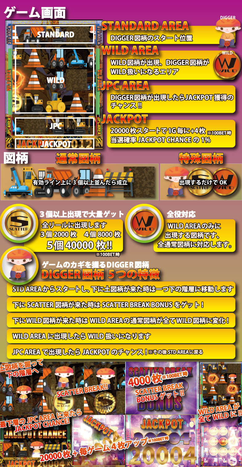 5リールNEW TYPE「DIG」はMAXベット専用機ですトレジャーエリアの場合は5枚/10枚/20枚の3種類の台からお選び頂けます)。