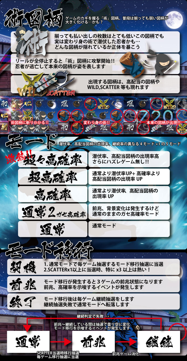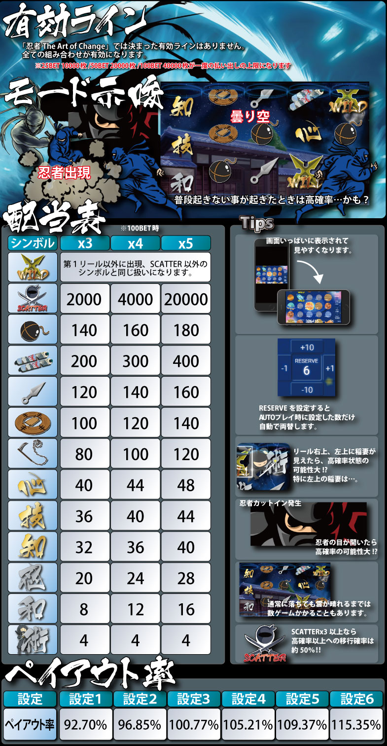 リールは自動的に停止し、有効ラインに揃った絵柄によってスロットメダルが払出されます。 ・終了:5リールNEW TYPE「忍者 the Art of Change」を終了します。獲得した経験値はこのボタンを押したときに反映されます。