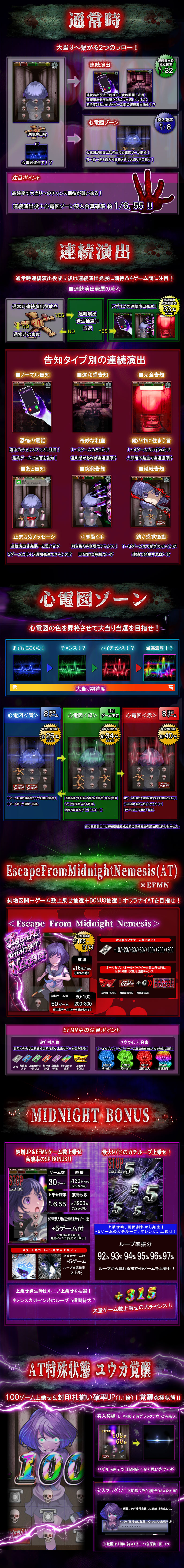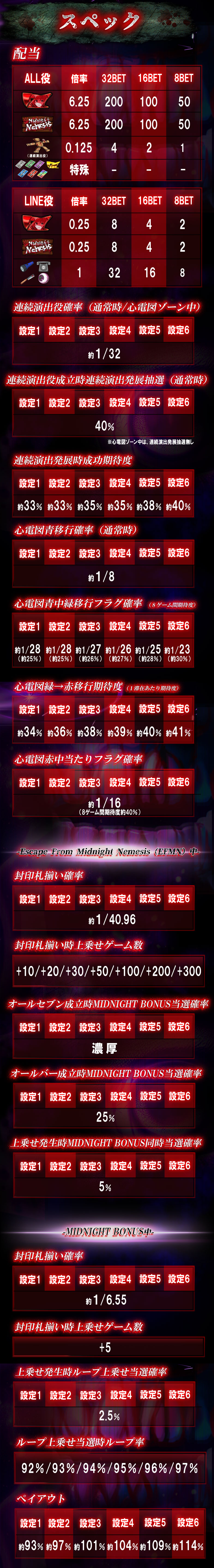8ラインスロット「Midnight Nemesis」を終了する際には必ず「終了」ボタンを押して下さい。ゲームのプレイ結果が表示され、獲得した経験値(EXP)がデータに反映されます。 このボタンを押さずに終了すると、獲得したEXPは1週間後に無効(破棄)となりますが、1週間以内に再度プレイするとデータは引き継がれます。