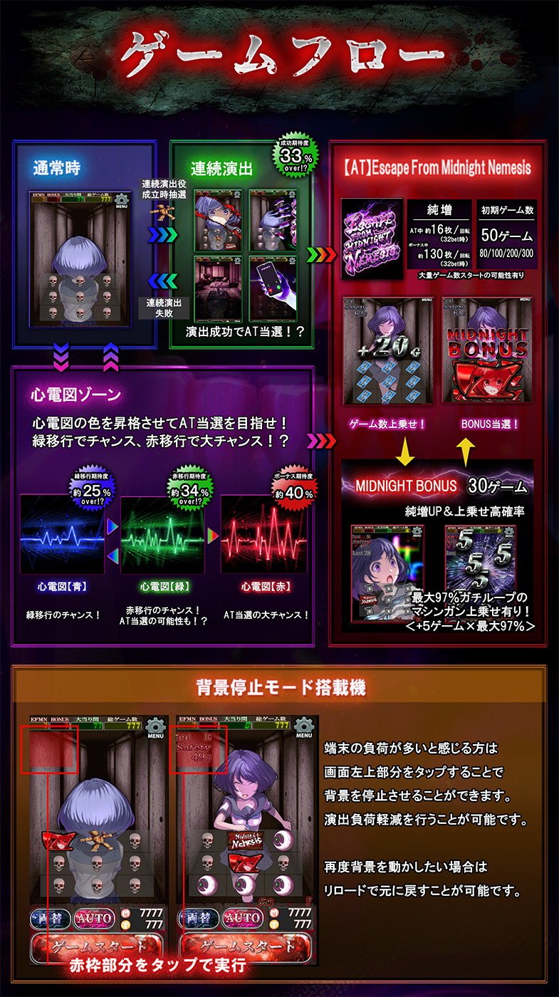 機種のスペックや、省電力モード等の性能を制限する機能がONの場合、リール停止や演出が正常に表示されない可能性がございます。