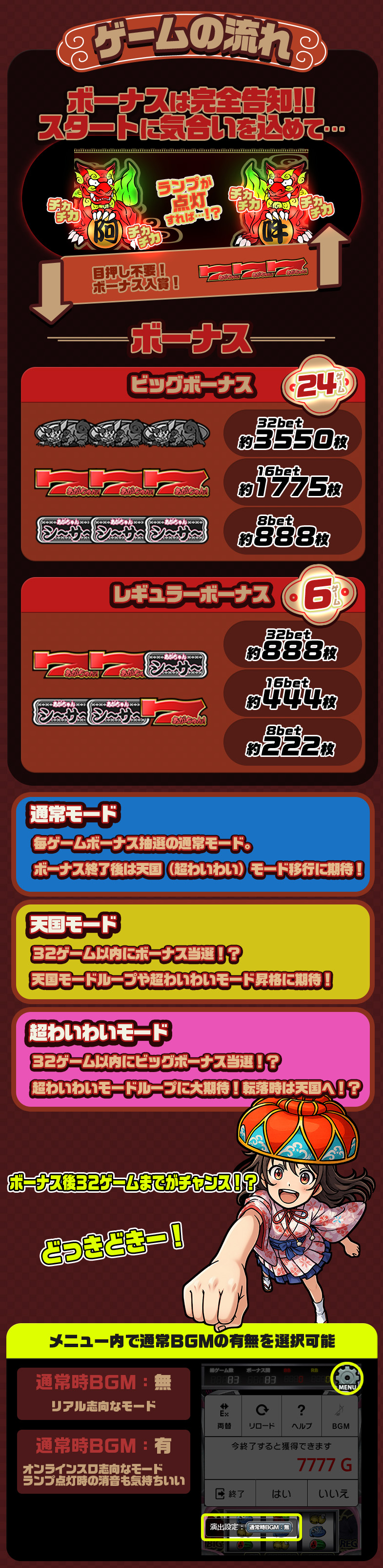 ・終了:8ラインスロット「わいわい!あがちゅん!シ~サ~ 32Gver」を終了します。獲得した経験値はこのボタンを押したときに反映されます。