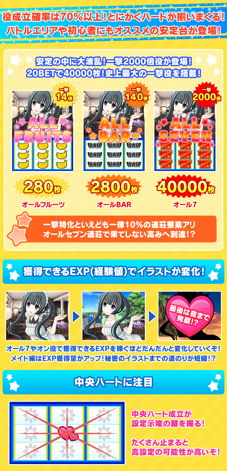 8ラインスロット「常夏パラダイス-メイド編-」はMAXベット専用機です(MAXベットはバトルエリアの場合5ポイントのみとなります。トレジャーエリアの場合は5枚/10枚/20枚の3種類の台からお選び頂けます)。