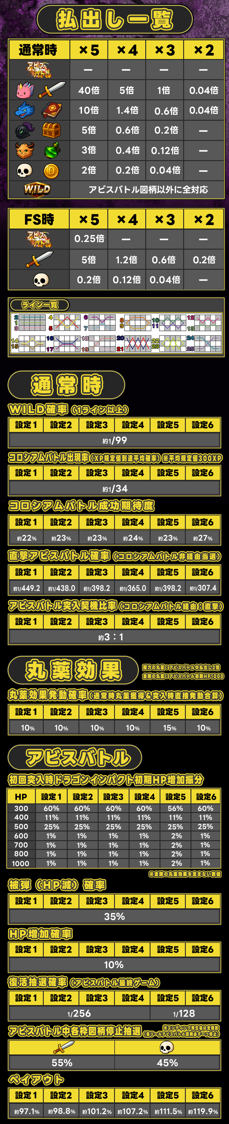 「」では1回のゲームで25枚/50枚/100枚のスロットメダルをベットすることができ、対応するラインに各絵柄が揃うと払出しを受けることが出来ます。