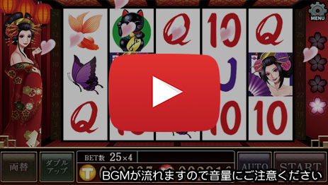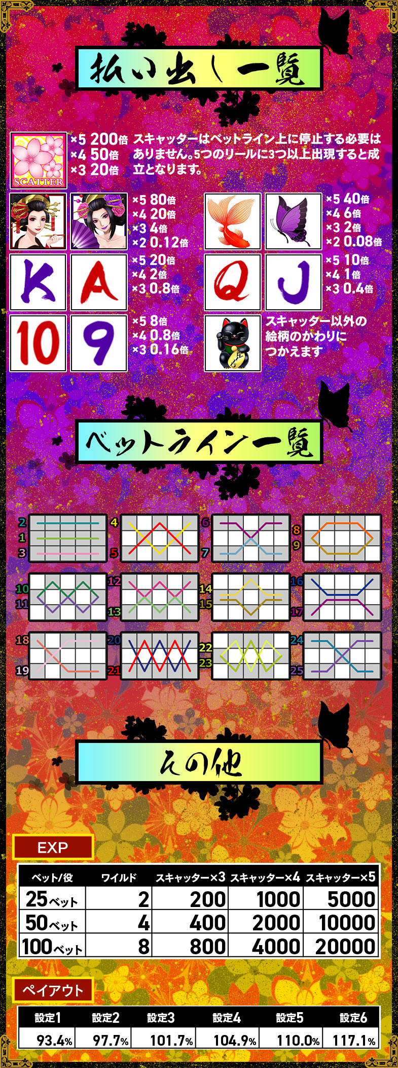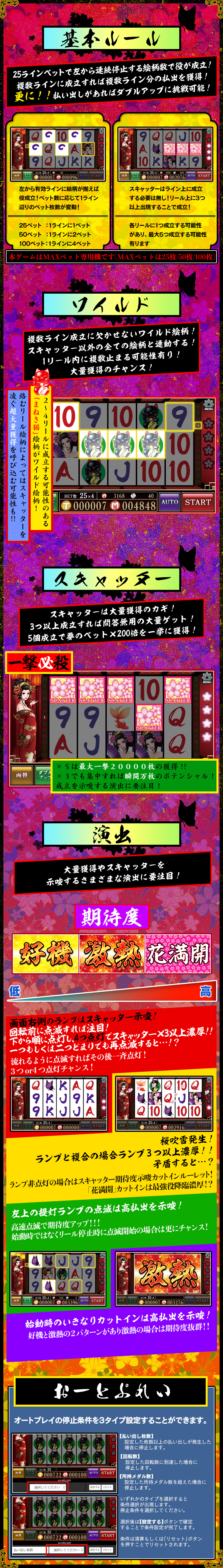 5ラインスロット「桜花伝」はMAXベット専用機です(25枚/50枚/100枚の3種類の台からお選び頂けます)。