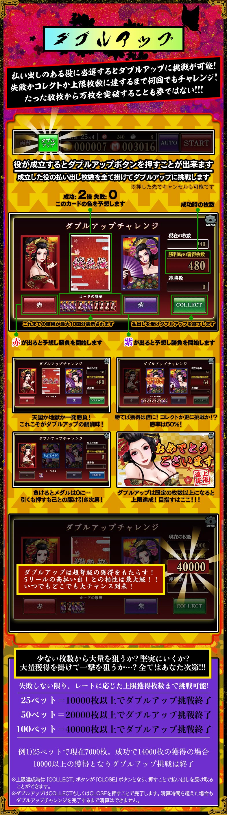 画面中央に裏返しで置いてあるカードが、「赤」か「紫」かを予想して下さい。 見事に当たると、獲得したメダルが2倍になります。 残念ながら外れてしまうと、獲得したメダルは0になってしまいます。 ダブルアップゲームは各レートの上限枚数達成まで行うことができます。