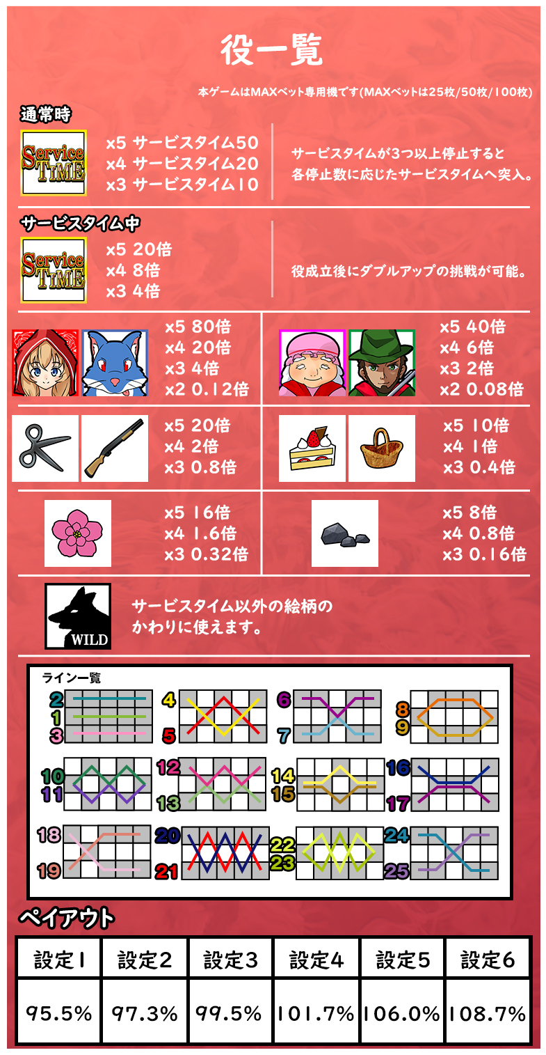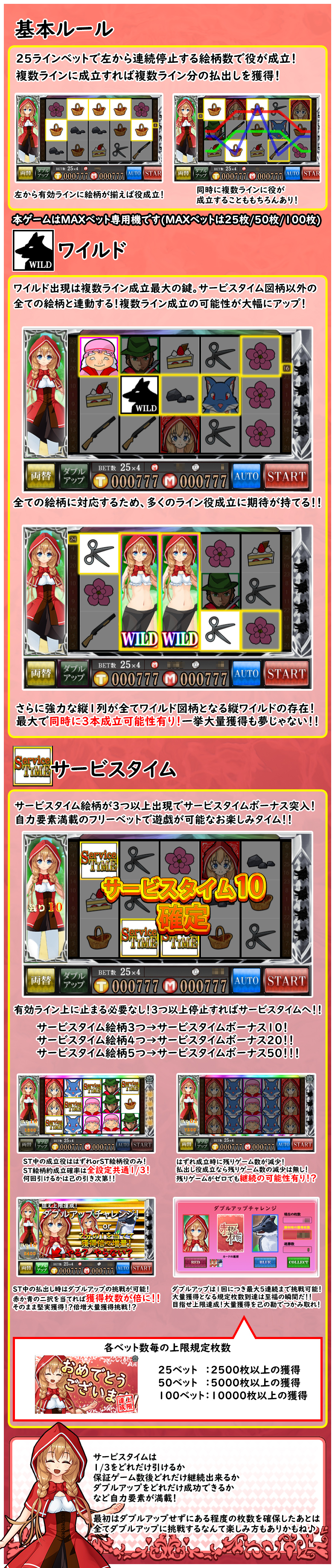 赤ずきんとオオカミ「5リールスロット」はMAXベット専用機です(25枚/50枚/100枚の3種類の台からお選び頂けます)。